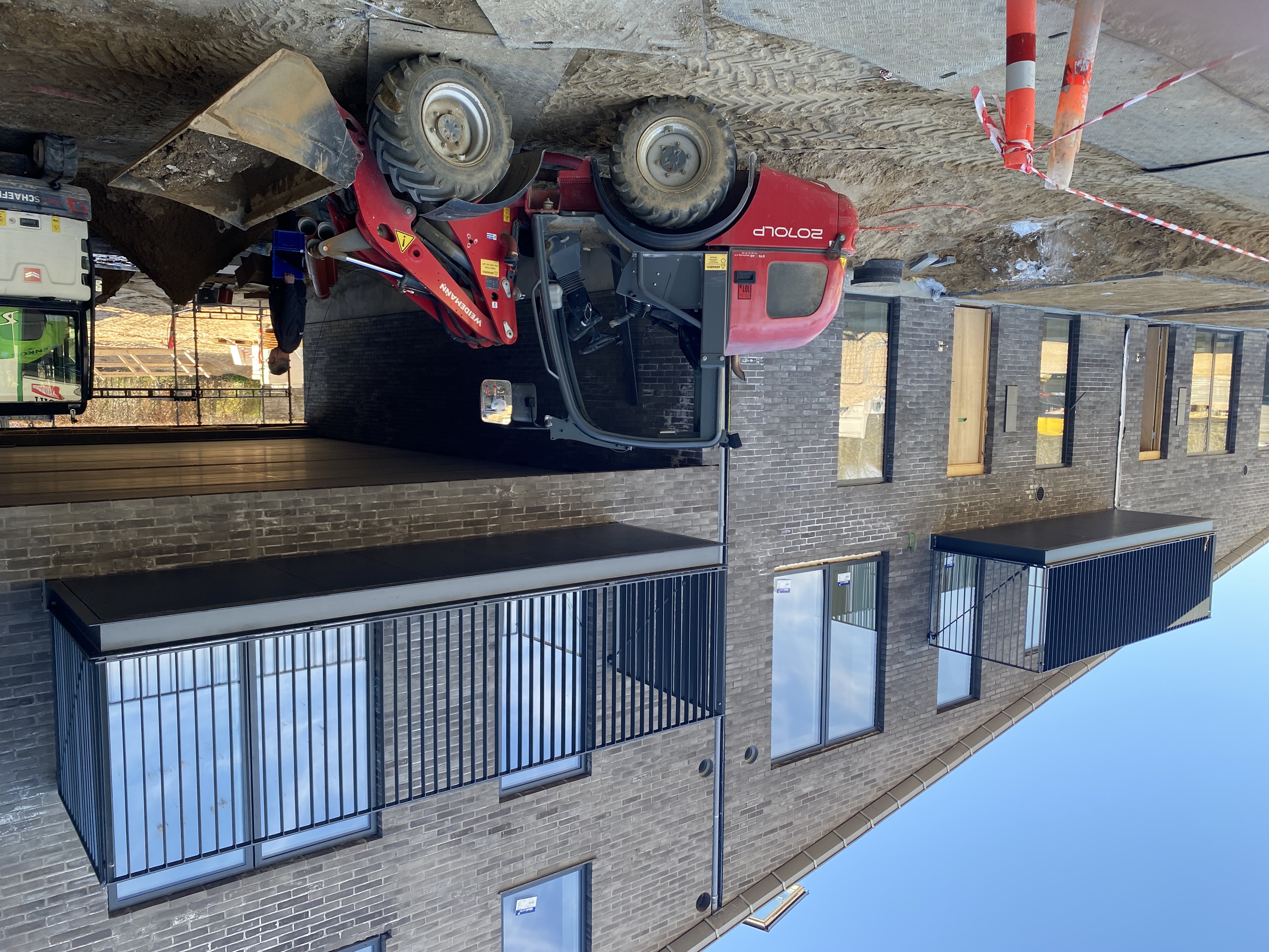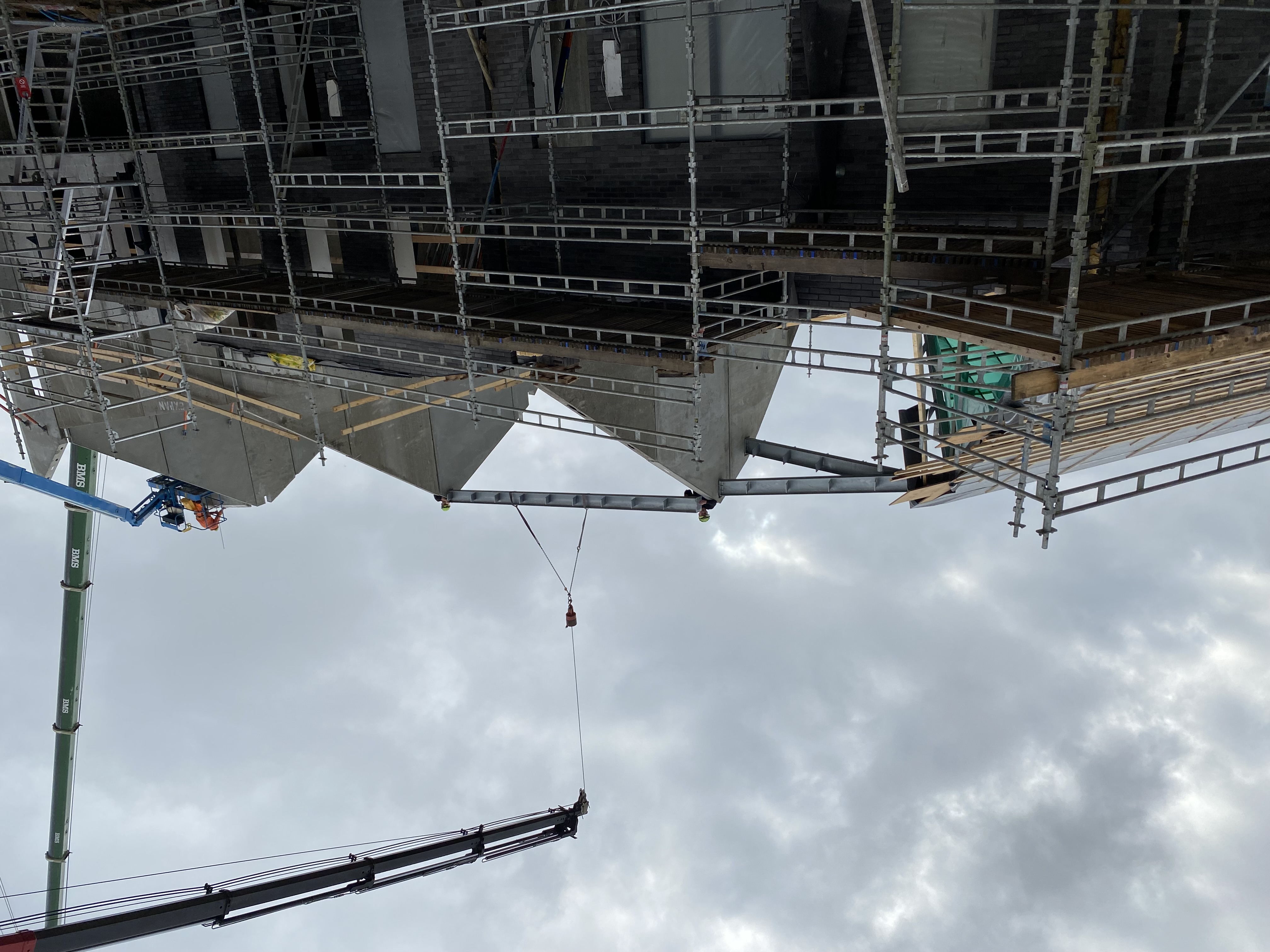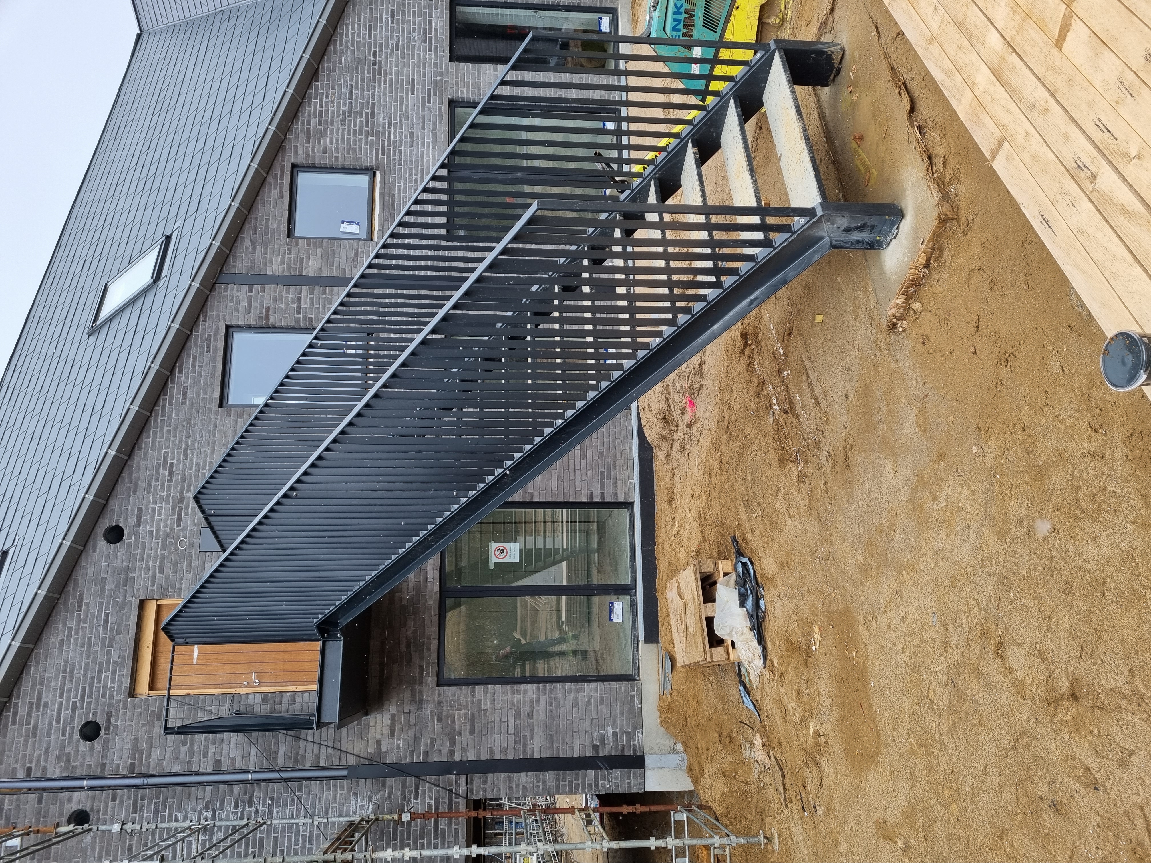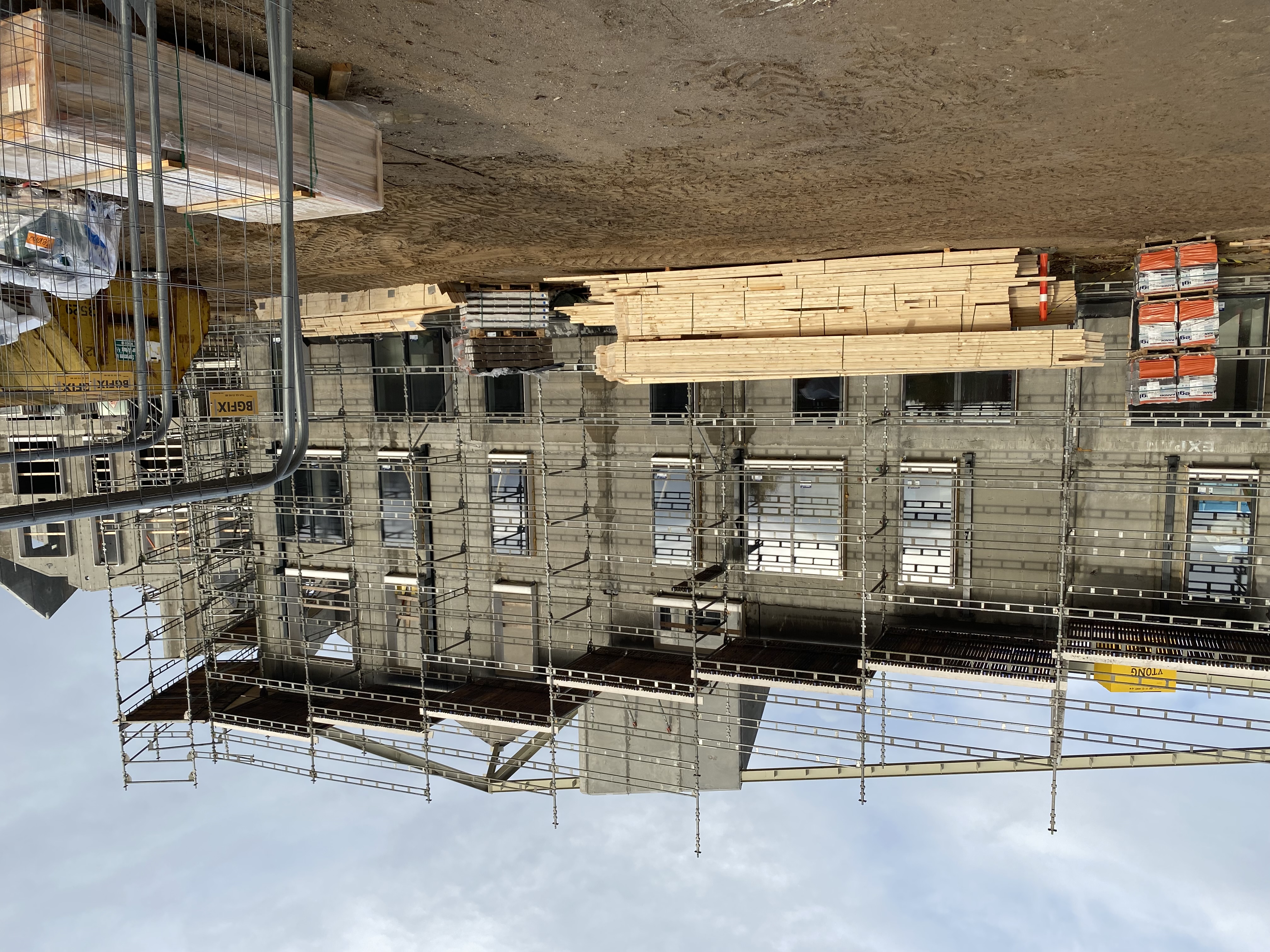 Vi er netop nu i disse dage begyndt på montagen af trapper, repos og altaner på den første del.