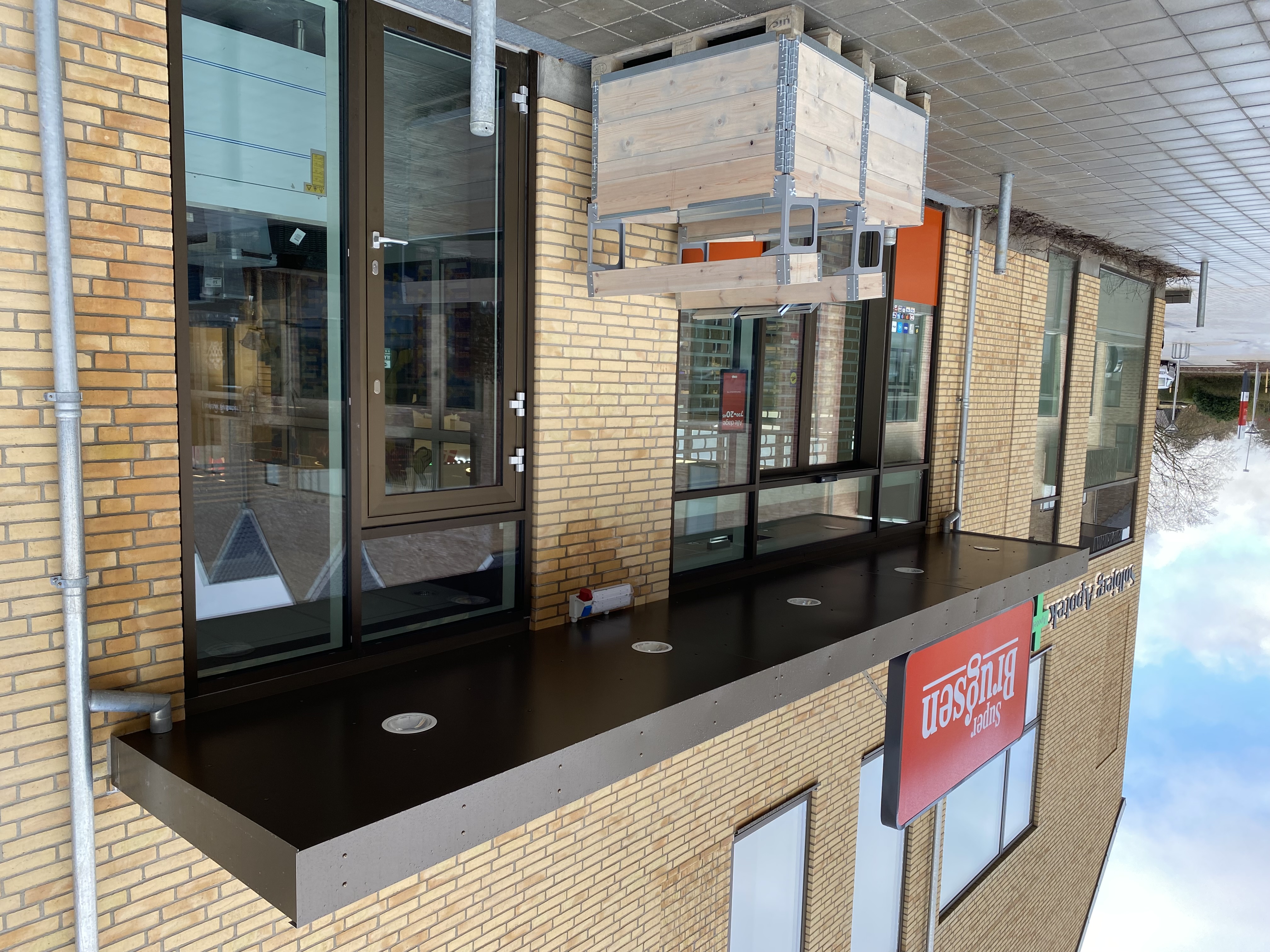 Vi har leveret og monteret baldakiner ved hovedindgang og flaskeautomat på COOP’s nye butik, samt en flugtvejstrappe med tilhørende indgangsparti og dør.