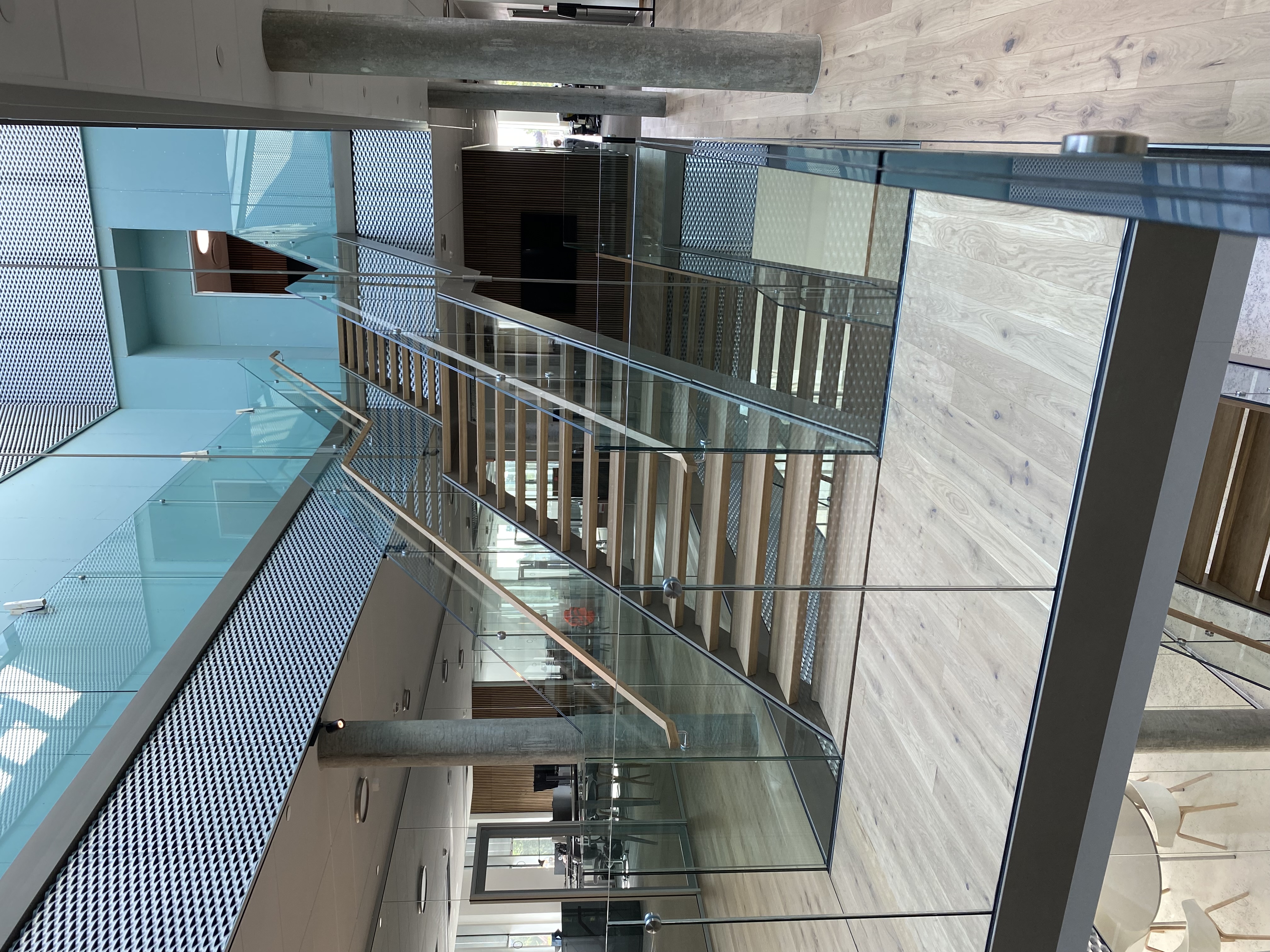 En stor hovedtrappe og glasværn i atrium.